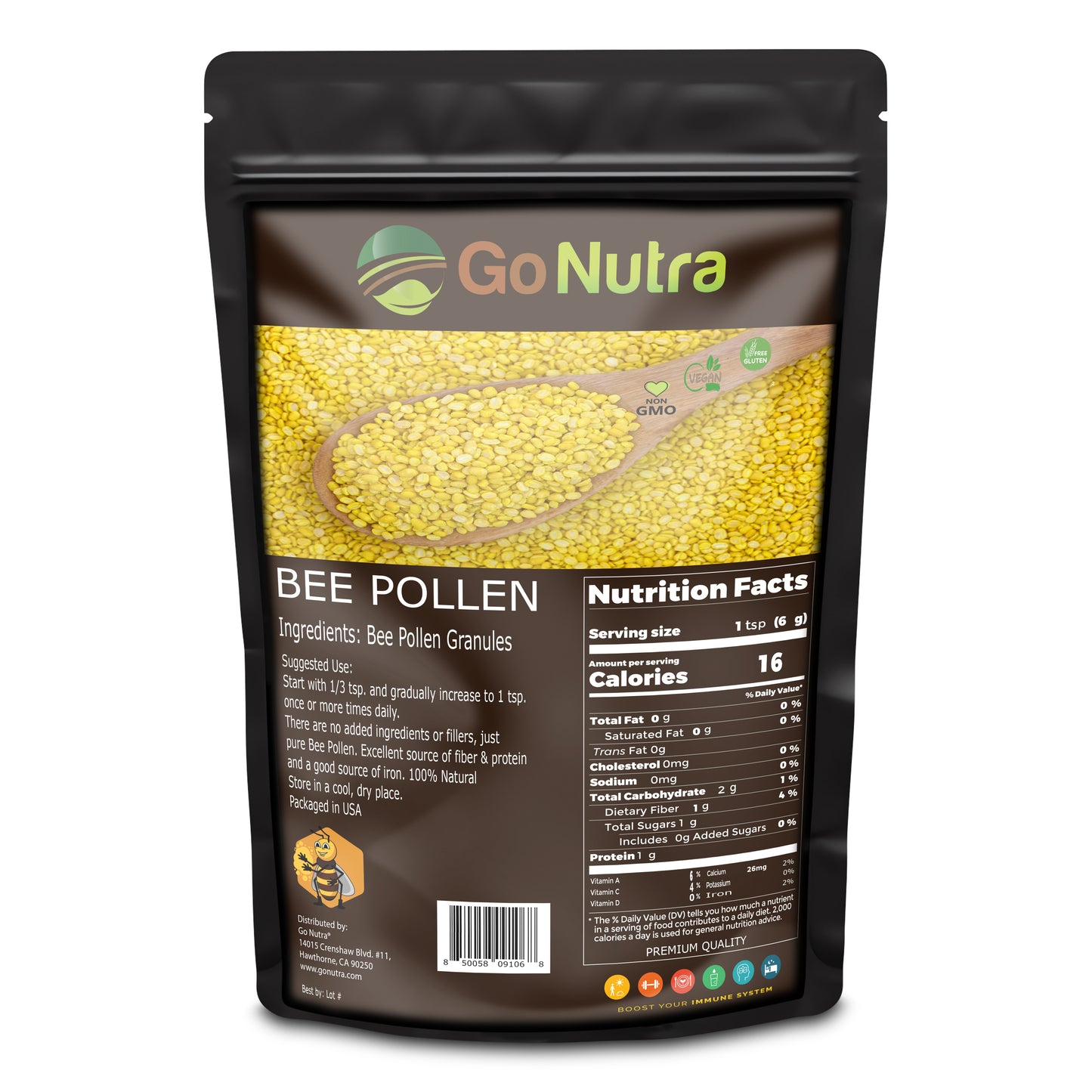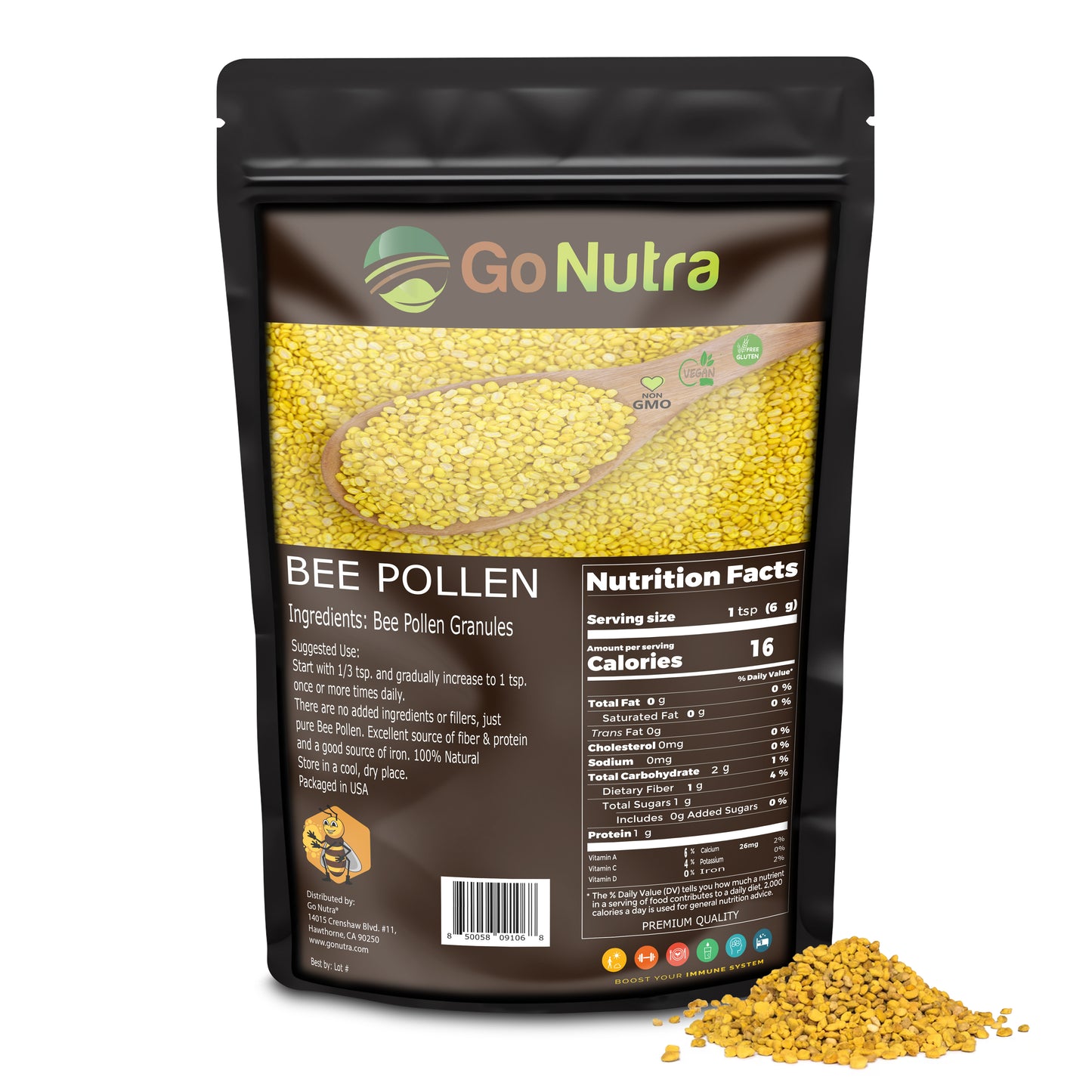 Go Nutra's Bee Pollen granules are pure and all natural. Freshly harvested bee pollen granules that have a raw sweet flavor. Bee Pollen is a natural superfood that retains biologically active nutrients, including protein, carbs, fats, vitamins, minerals, amino acids, and more. Bee Pollen is a natural nutritional powerhouse.