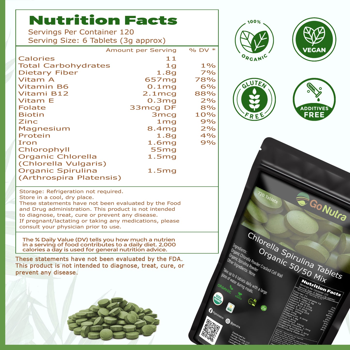 Go Nutra® Organic Spirulina & Chlorella Tablets 50/50 Blend, Non-GMO, 720 Count, 4 Month Supply